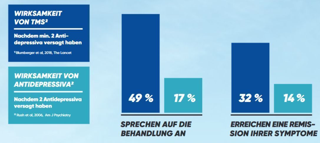 In der weltweit größten randomisierten placebokontrollierten Studie an depressiven Patienten, bei denen zwei Antidepressiva versagt hatten, sprachen 49% der therapieresistenten Patienten auf TMS an, und 32% erreichten eine vollständige Remission (Blumberger et al., 2018). Zum Vergleich: Beim dritten Antidepressivum liegt die Ansprechrate bei 17% und die Remissionsrate bei 14% (Rush et al., 2006).